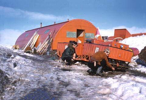 Denis St Onge and Richard Moskal cleaning mud from tracks of our snow mobile. Most frustrating. Quonset hut, our building for sleeping and accommodating equipment. Very comfortable.